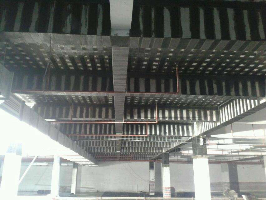 4、粘貼碳纖維片材,按設計要求裁剪碳纖維布。根據比例稱取所需膠量,進行充分混合。將混合好的浸漬膠均勻涂抹于所要粘貼的部位并粘貼碳纖維布。在搭接、拐角處可適當多涂些膠。用光滑的滾筒順纖堆方向多次滾壓,擠除氣泡使浸漬膠充分浸透碳纖維布,滾壓時不得損傷碳纖維布,多層粘貼重復上述步驟,在最后一層碳纖維布的表面均勻涂抹一層浸漬膠。